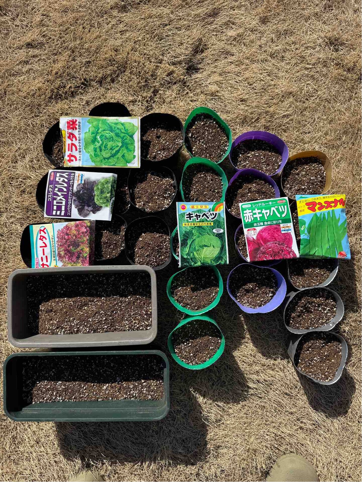 イタリアンナス、インゲン、サラダ菜、キャベツ播種